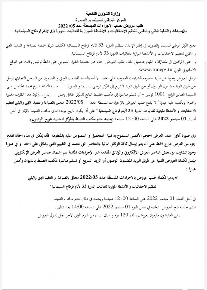 طلب عروض حسب الإجراءات المبسطة عدد 05/ 2022 للصياغة والتنفيذ الفني والتقني لتنظيم الاحتفاليات و الأنشطة الموازية لفعاليات الدورة 33 لأيام قرطاج السينمائية