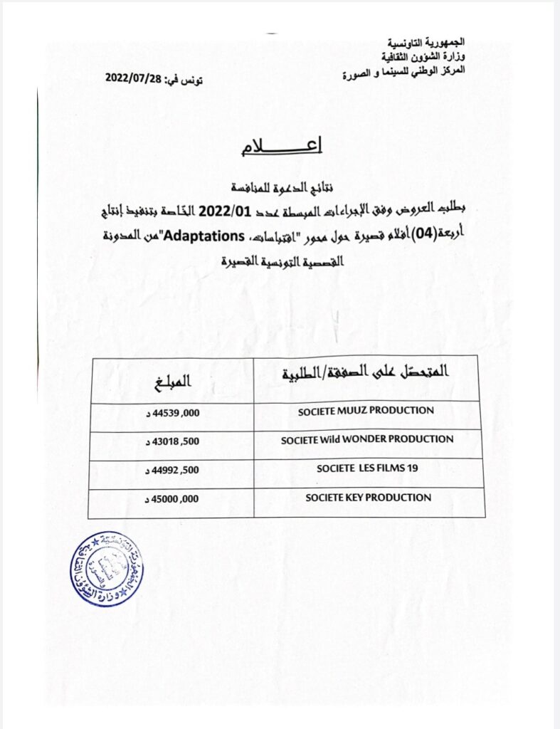 نتائـج الدعـوة للمنافسـة بطلب العروض وفق الإجراءات المبسطة عدد 01/2022 الخّــاصة بتنفيذ إنتاج أربعة(04)أفلام قصيرة حول محور « اقتباسات، Adaptations »من المدونة القصصية التونسية القصيرة في إطار الدورة 33 لأيام قرطاج السينمائية