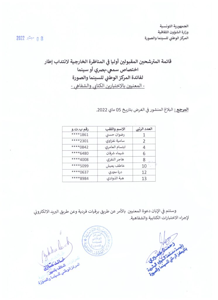 قائمة المترشحين المقبولين أوليا في المناظرة الخارجية لانتداب إطار اختصاص سمعي-بصري أو سينما لفائدة المركز الوطني للسينما والصورة