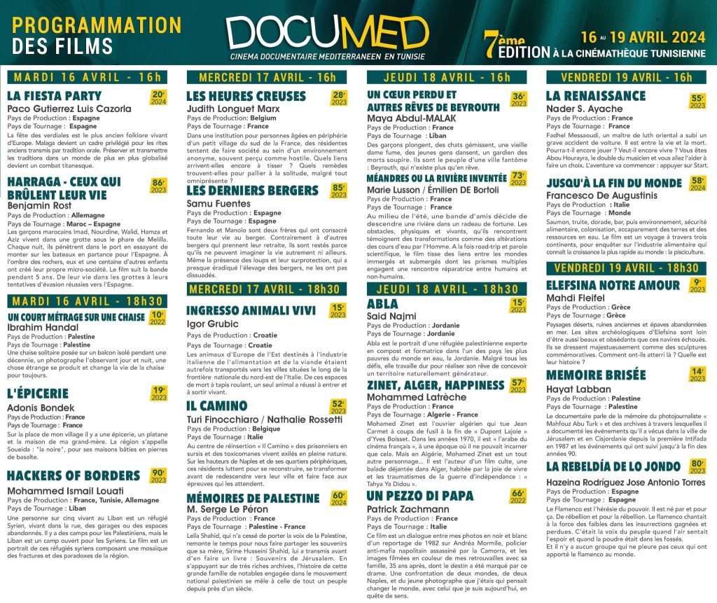 Avr 15 2024 0 La 7e édition du Festival DOCUMED est organisée par l’Association Cinéma Documentaire Tunisien en collaboration avec la Cinémathèque Tunisienne, du 16 au 19 avril 2024 à la salle Tahar Chériaa – Cité de la Culture Chedli Klibi Navigation de l’article Article précédentPrécédente Programme de la salle “Ciné 350” du 12 au 14 avril 2024Article suivantSuivante Programme de la salle “Ciné 350” du 16 au 21 avril 2024