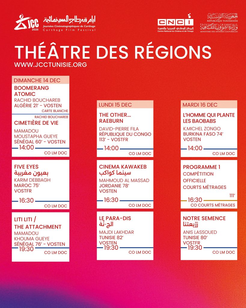 Déc 11 2025 Non Programme officiel de la 36ème session des Journées Cinématographiques de Carthage du 13 au 20 décembre 2025 Navigation de l’article Article précédentPrécédente 36ème édition des JCC: Panels & RencontreArticle suivantSuivante Retour en images sur la cérémonie d’ouverture de la 36ème session des JCC