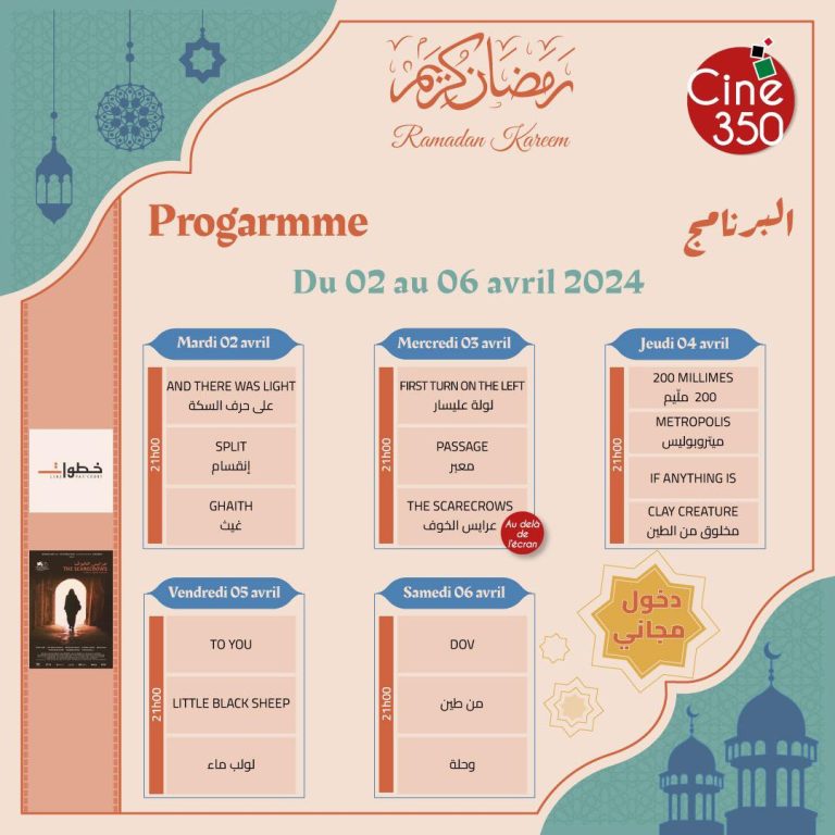 Avr 01 2024 0 La semaine du court métrage à la salle Ciné 350 du 02 au 06 avril 2024 – Cité de la Culture Chedli klibii Navigation de l’article Article précédentPrécédente Ramadan à la Cinémathèque Tunisienne: Les soirées 35mm du 03 au 05 avril 2024Article suivantSuivante Programme de la salle “Ciné 350” du 12 au 14 avril 2024