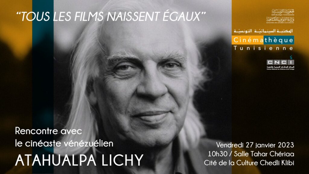 « Tous les films naissent égaux » » : Rencontre avec le cinéaste vénézuélien Atahualpa Lichy, en collaboration avec l’Ambassade du Venezuela à Tunis. Merci de réserver vos places avant le 27 janvier 2023 en remplissant le formulaire ci-dessous : https://forms.gle/KLJzDbk89iCqaDkY8